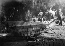 Chumash elder Fernando Librado Kitsepawit (right) directing the building of a tomol